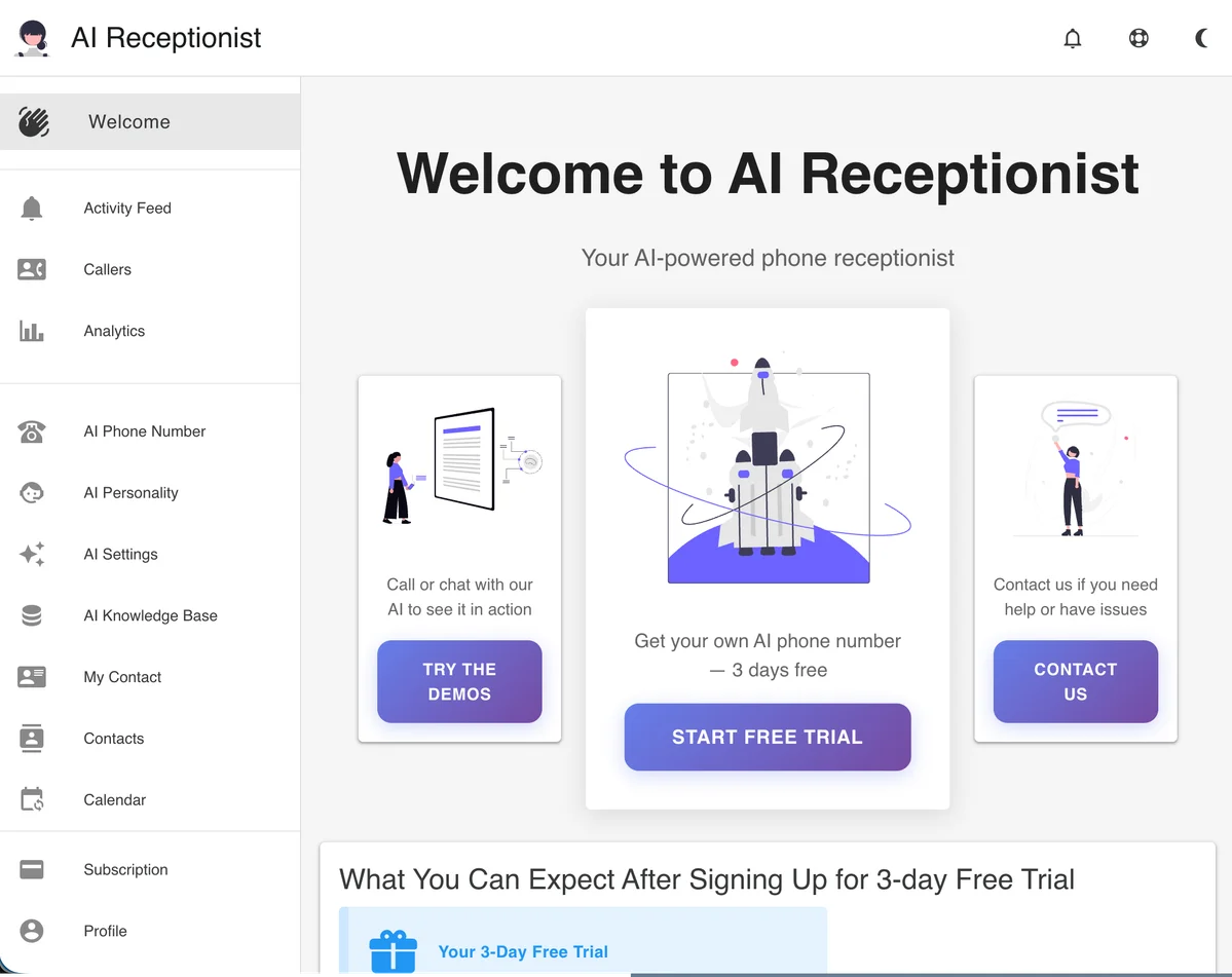 The Welcome page is the first thing you see when you sign up or start your free trial. It provides a step-by-step onboarding guide to help you get your AI Receptionist up and running quickly. Follow the recommended setup steps including choosing your plan, locking in your phone number, customizing your greeting, adding instructions, uploading knowledge base items, tuning the AI personality, testing your receptionist, and optionally setting up call forwarding. The Welcome page is available during your trial period and disappears once you transition to a paid subscription.